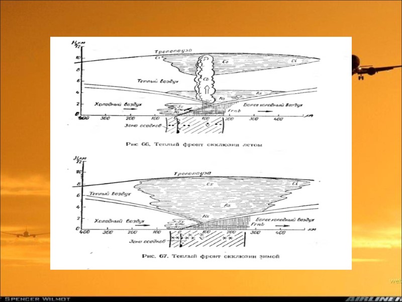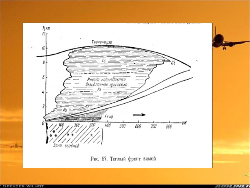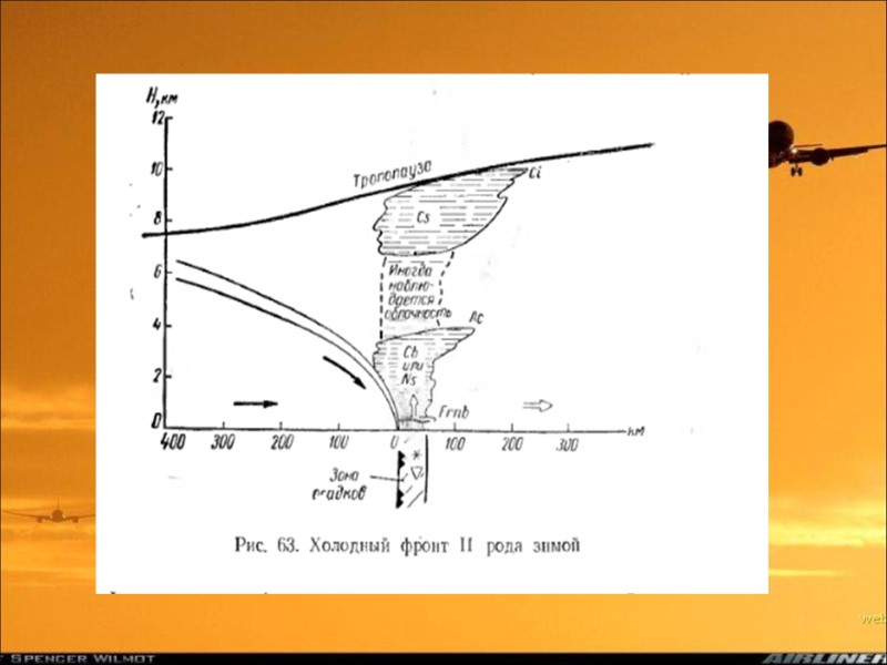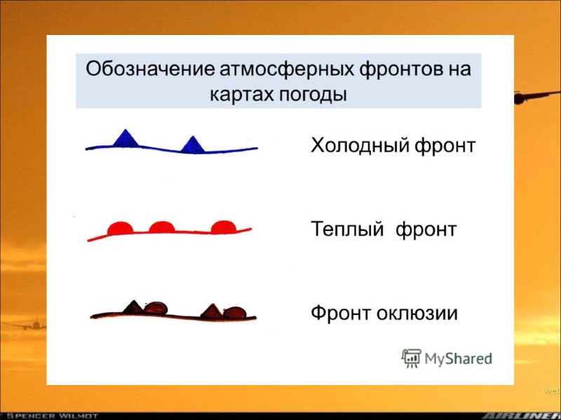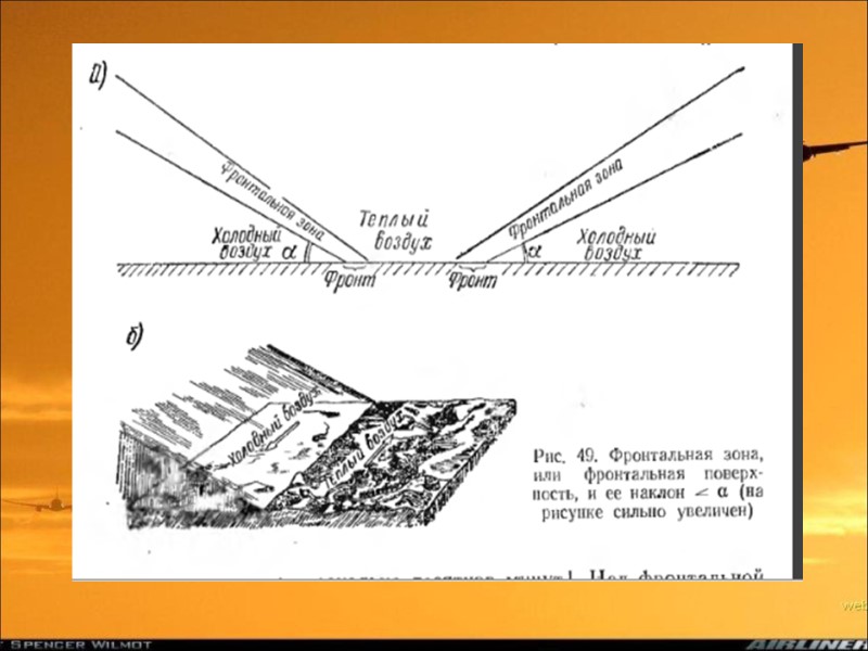 а Атмосферный фронт-переходная зона между соседними воздушными массами Фронт на карте погоды-линия пересечения фронтальной поверхности с поверхностью земли. Угол наклона фронта зависит: контраст температуры в зоне фронта разница скоростей ветра вблизи фронта в тёплой и холодной воздушных масс скорость смещения фронта географическая широта