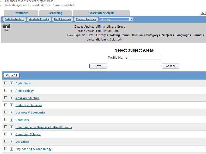 Interdisciplinary Studies Analyses The interdisciplinary studies enhancement helps libraries: • Define their own unique interdisciplinary studies area • Easily navigate through the OCLC Conspectus • identify titles in multiple subject areas • Compare interdisciplinary studies collection against peer libraries • identify overlaps and gaps • Limit an analysis by Category and/or Subject in addition to Division • Save Subject Profiles and have them available for use in the future Demo: http: //vidego. multicastmedia. com/player. php? p=u 3 t 34 bs 7