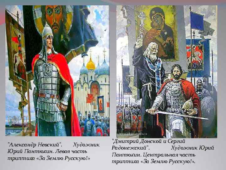 "Александр Невский". Художник Юрий Пантюхин. Левая часть триптиха «За Землю Русскую!» "Дмитрий Донской и Сергий Радонежский". Художник Юрий Пантюхин. Центральная часть триптиха «За Землю Русскую!» .