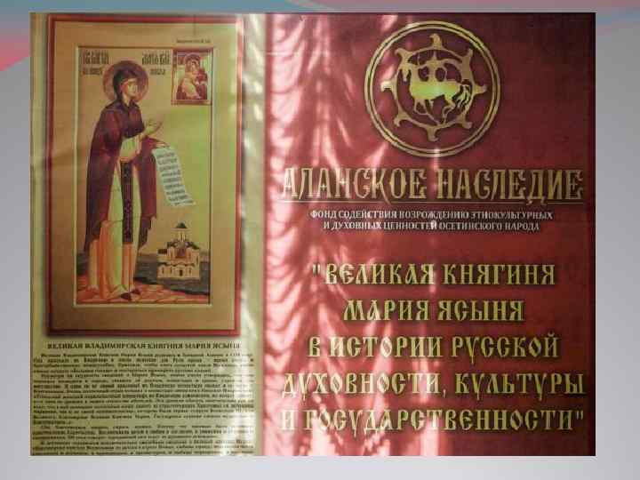 Историческая справка. Великая Владимирская Княгиня Мария Ясыня, супруга Князя Всеволода «Большое Гнездо» , родилась в Западной Алании в 1158 году. Историкам известно, что Мария Ясыня помогала возводить в городе Владимире многие монастыри и храмы. Не случайно один из самых красивых в городе монастырей назван в ее честь – Княгининым. «Эта древняя обитель замечательна как по тому, что в ней почивают нетленныя мощи одного из страстотерпцев Христовых св. мученика Авраамия, так и по своей основательнице, которою была первая супруга Всеволода III, или Великого, Благоверная Великая Княгиня Мария, Государыня славная своими мудростию и благочестием…» , - писал о монастыре священник Николай Флоринский. В летописях содержатся исключительно хвалебные сведения о великой княгине Марии: «Благоверная княгиня Всеволожая из детска в страсе Божье, любяще правду, воздающее честь епископом и игуменом, и черноризцем, и презвитером, и любяще черноризцы, и подаваше требованием им; бяше бо нищелюбица и страннолюбица, печальныа, и нужныа, и больныя тех всех утешаше, и подаваше им требуемое» . Все князья Северо-Восточной Руси, в том числе и великие князья Московские и цари, были потомками Марии Ясыни. Знаменитый князь-полководец Александр Невский приходился ей внуком. На сестрах Марии Ясыни женились еще два князя: внук Мстислава Великого новгородский князь Ярослав Владимирович, прославившийся строительством храма Спаса Нередицы в честь рано скончавшейся супруги, и великий князь Киевский Мстислав Романович, погибший в битве с передовыми отрядами Чингисхана на реке Калке в 1223 г. Через века дошли до нас эпитеты, которыми награждали Марию Ясыню летописцы: Российская Елена, Феодора, вторая Ольга.