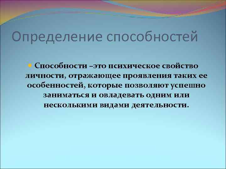Определение способностей Способности –это психическое свойство личности, отражающее проявления таких ее особенностей, которые позволяют успешно заниматься и овладевать одним или несколькими видами деятельности.