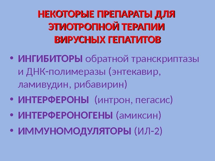 НЕКОТОРЫЕ ПРЕПАРАТЫ ДЛЯ ЭТИОТРОПНОЙ ТЕРАПИИ ВИРУСНЫХ ГЕПАТИТОВ • ИНГИБИТОРЫ обратной транскриптазы и ДНК-полимеразы (энтекавир, ламивудин, рибавирин) • ИНТЕРФЕРОНЫ (интрон, пегасис) • ИНТЕРФЕРОНОГЕНЫ (амиксин) • ИММУНОМОДУЛЯТОРЫ (ИЛ-2)