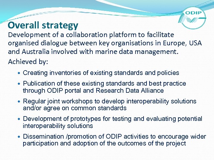 Overall strategy Development of a collaboration platform to facilitate organised dialogue between key organisations in Europe, USA and Australia involved with marine data management. Achieved by: Creating inventories of existing standards and policies Publication of these existing standards and best practice through ODIP portal and Research Data Alliance Regular joint workshops to develop interoperability solutions and/or agree on common standards Development of prototypes for testing and evaluating potential interoperability solutions Dissemination /promotion of ODIP activities to encourage wider participation and adoption of the outcomes of the project