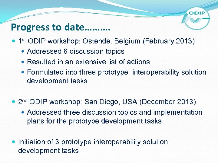 Progress to date………. 1 st ODIP workshop: Ostende, Belgium (February 2013) Addressed 6 discussion topics Resulted in an extensive list of actions Formulated into three prototype interoperability solution development tasks 2 nd ODIP workshop: San Diego, USA (December 2013) Addressed three discussion topics and implementation plans for the prototype development tasks Initiation of 3 prototype interoperability solution development tasks