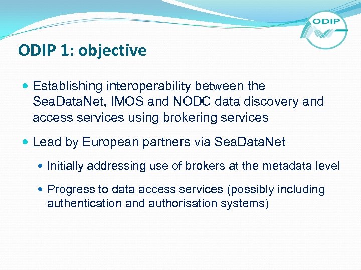 ODIP 1: objective Establishing interoperability between the Sea. Data. Net, IMOS and NODC data discovery and access services using brokering services Lead by European partners via Sea. Data. Net Initially addressing use of brokers at the metadata level Progress to data access services (possibly including authentication and authorisation systems)
