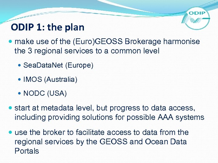 ODIP 1: the plan make use of the (Euro)GEOSS Brokerage harmonise the 3 regional services to a common level Sea. Data. Net (Europe) IMOS (Australia) NODC (USA) start at metadata level, but progress to data access, including providing solutions for possible AAA systems use the broker to facilitate access to data from the regional services by the GEOSS and Ocean Data Portals