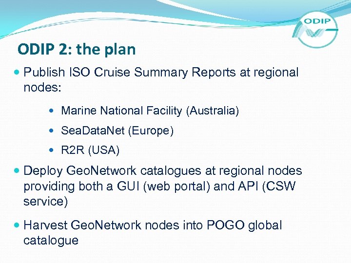 ODIP 2: the plan Publish ISO Cruise Summary Reports at regional nodes: Marine National Facility (Australia) Sea. Data. Net (Europe) R 2 R (USA) Deploy Geo. Network catalogues at regional nodes providing both a GUI (web portal) and API (CSW service) Harvest Geo. Network nodes into POGO global catalogue