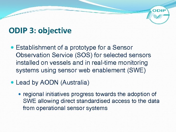 ODIP 3: objective Establishment of a prototype for a Sensor Observation Service (SOS) for selected sensors installed on vessels and in real-time monitoring systems using sensor web enablement (SWE) Lead by AODN (Australia) regional initiatives progress towards the adoption of SWE allowing direct standardised access to the data from operational sensor systems