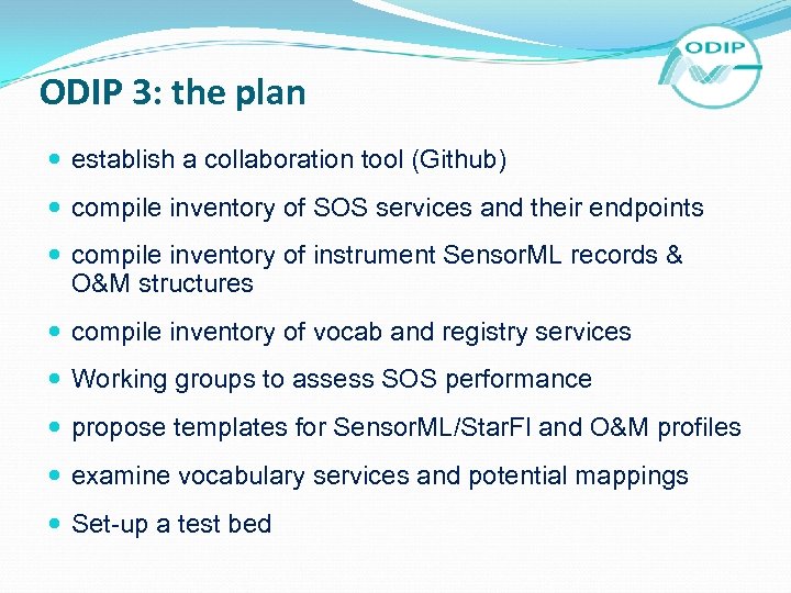ODIP 3: the plan establish a collaboration tool (Github) compile inventory of SOS services and their endpoints compile inventory of instrument Sensor. ML records & O&M structures compile inventory of vocab and registry services Working groups to assess SOS performance propose templates for Sensor. ML/Star. Fl and O&M profiles examine vocabulary services and potential mappings Set-up a test bed