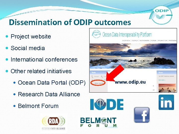 Dissemination of ODIP outcomes Project website Social media International conferences Other related initiatives Ocean Data Portal (ODP) Research Data Alliance Belmont Forum www. odip. eu