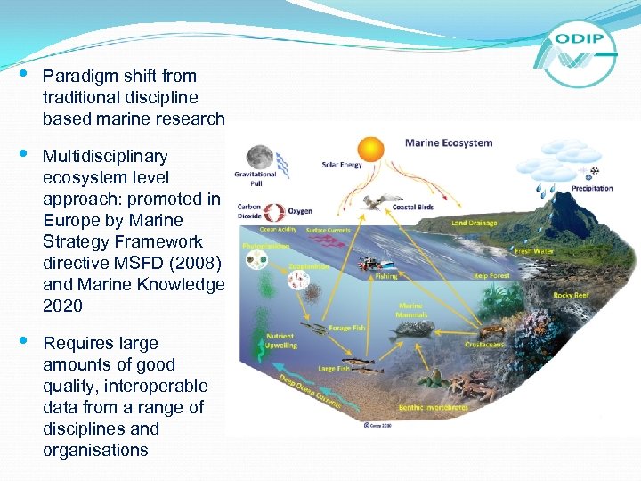 • Paradigm shift from traditional discipline based marine research • Multidisciplinary ecosystem level approach: promoted in Europe by Marine Strategy Framework directive MSFD (2008) and Marine Knowledge 2020 • Requires large amounts of good quality, interoperable data from a range of disciplines and organisations