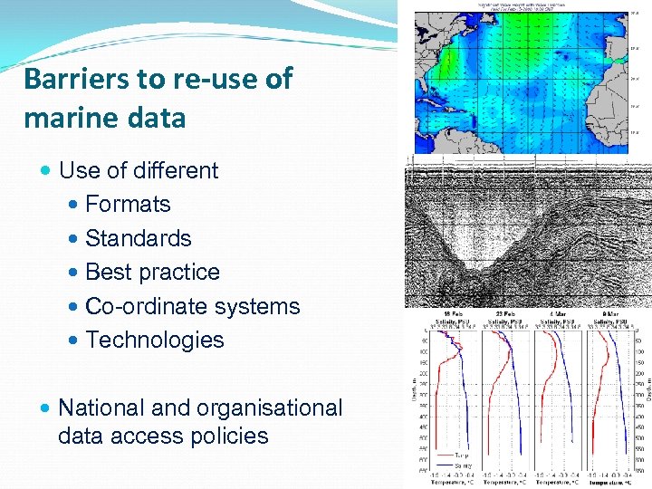 Barriers to re-use of marine data Use of different Formats Standards Best practice Co-ordinate systems Technologies National and organisational data access policies 3