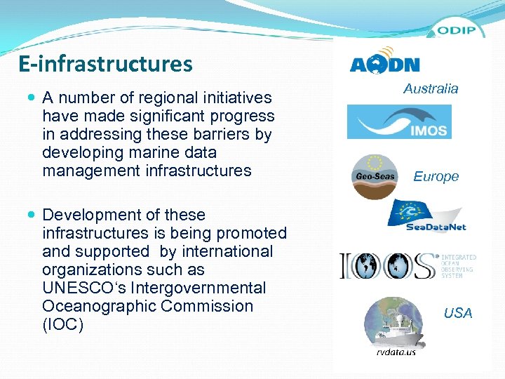 E-infrastructures A number of regional initiatives have made significant progress in addressing these barriers by developing marine data management infrastructures Development of these infrastructures is being promoted and supported by international organizations such as UNESCO‘s Intergovernmental Oceanographic Commission (IOC) Australia Europe USA