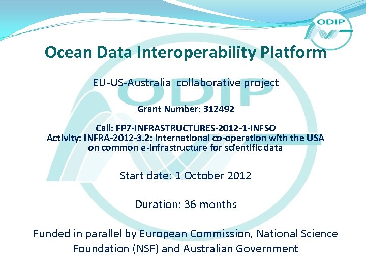 Ocean Data Interoperability Platform EU-US-Australia collaborative project Grant Number: 312492 Call: FP 7 -INFRASTRUCTURES-2012 -1 -INFSO Activity: INFRA-2012 -3. 2: International co-operation with the USA on common e-infrastructure for scientific data Start date: 1 October 2012 Duration: 36 months Funded in parallel by European Commission, National Science Foundation (NSF) and Australian Government