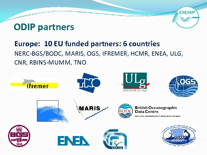 ODIP partners Europe: 10 EU funded partners: 6 countries NERC-BGS/BODC, MARIS, OGS, IFREMER, HCMR, ENEA, ULG, CNR, RBINS-MUMM, TNO