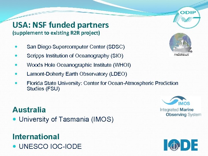 USA: NSF funded partners (supplement to existing R 2 R project) San Diego Supercomputer Center (SDSC) Scripps Institution of Oceanography (SIO) Woods Hole Oceanographic Institute (WHOI) Lamont-Doherty Earth Observatory (LDEO) Florida State University: Center for Ocean-Atmospheric Prediction Studies (FSU) Australia University of Tasmania (IMOS) International UNESCO IOC-IODE