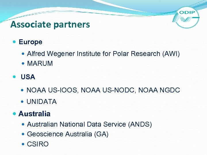Associate partners Europe Alfred Wegener Institute for Polar Research (AWI) MARUM USA NOAA US-IOOS, NOAA US-NODC, NOAA NGDC UNIDATA Australian National Data Service (ANDS) Geoscience Australia (GA) CSIRO