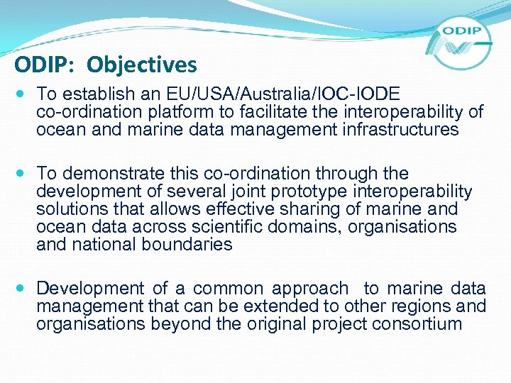 ODIP: Objectives To establish an EU/USA/Australia/IOC-IODE co-ordination platform to facilitate the interoperability of ocean and marine data management infrastructures To demonstrate this co-ordination through the development of several joint prototype interoperability solutions that allows effective sharing of marine and ocean data across scientific domains, organisations and national boundaries Development of a common approach to marine data management that can be extended to other regions and organisations beyond the original project consortium