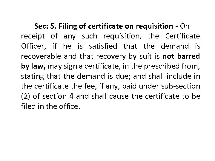 Sec: 5. Filing of certificate on requisition - On receipt of any such requisition, the Certificate Officer, if he is satisfied that the demand is recoverable and that recovery by suit is not barred by law, may sign a certificate, in the prescribed from, stating that the demand is due; and shall include in the certificate the fee, if any, paid under sub-section (2) of section 4 and shall cause the certificate to be filed in the office.