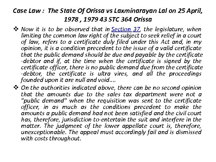Case Law : The State Of Orissa vs Laxminarayan Lal on 25 April, 1978 , 1979 43 STC 364 Orissa v Now it is to be observed that in Section 37, the legislature, when limiting the common law right of the subject to seek relief in a court of law, refers to a certificate duly filed under this Act and, in my opinion, it is a condition precedent to the issue of a valid certificate that the public demand should be due and payable by the certificate -debtor and if, at the time when the certificate is signed by the certificate officer, there is no public demand due from the certificate -debtor, the certificate is ultra vires, and all the proceedings founded upon it are null and void. . v On the authorities indicated above, there can be no second opinion that the amounts due to the sales tax department were not a "public demand" when the requisition was sent to the certificate officer, in as much as the conditions precedent to make the amounts a public demand had not been satisfied and the civil court has, therefore, jurisdiction to-entertain the suit and interfere in the matter. The judgment of the lower appellate court is, therefore, unexceptionable. The appeal must accordingly fail and is dismissed with costs throughout.