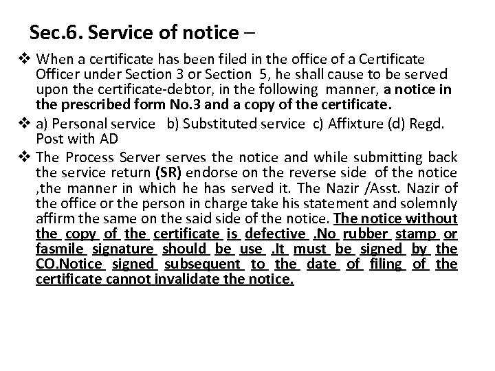 Sec. 6. Service of notice – v When a certificate has been filed in the office of a Certificate Officer under Section 3 or Section 5, he shall cause to be served upon the certificate-debtor, in the following manner, a notice in the prescribed form No. 3 and a copy of the certificate. v a) Personal service b) Substituted service c) Affixture (d) Regd. Post with AD v The Process Server serves the notice and while submitting back the service return (SR) endorse on the reverse side of the notice , the manner in which he has served it. The Nazir /Asst. Nazir of the office or the person in charge take his statement and solemnly affirm the same on the said side of the notice. The notice without the copy of the certificate is defective . No rubber stamp or fasmile signature should be use . It must be signed by the CO. Notice signed subsequent to the date of filing of the certificate cannot invalidate the notice.