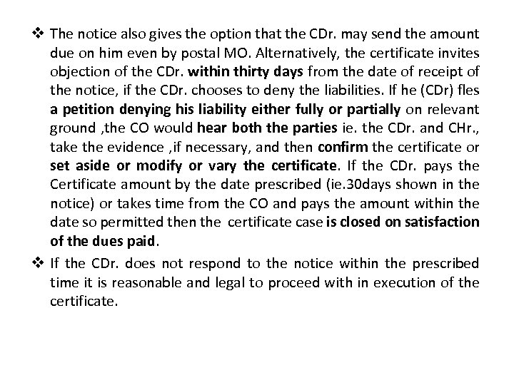 v The notice also gives the option that the CDr. may send the amount due on him even by postal MO. Alternatively, the certificate invites objection of the CDr. within thirty days from the date of receipt of the notice, if the CDr. chooses to deny the liabilities. If he (CDr) fles a petition denying his liability either fully or partially on relevant ground , the CO would hear both the parties ie. the CDr. and CHr. , take the evidence , if necessary, and then confirm the certificate or set aside or modify or vary the certificate. If the CDr. pays the Certificate amount by the date prescribed (ie. 30 days shown in the notice) or takes time from the CO and pays the amount within the date so permitted then the certificate case is closed on satisfaction of the dues paid. v If the CDr. does not respond to the notice within the prescribed time it is reasonable and legal to proceed with in execution of the certificate.