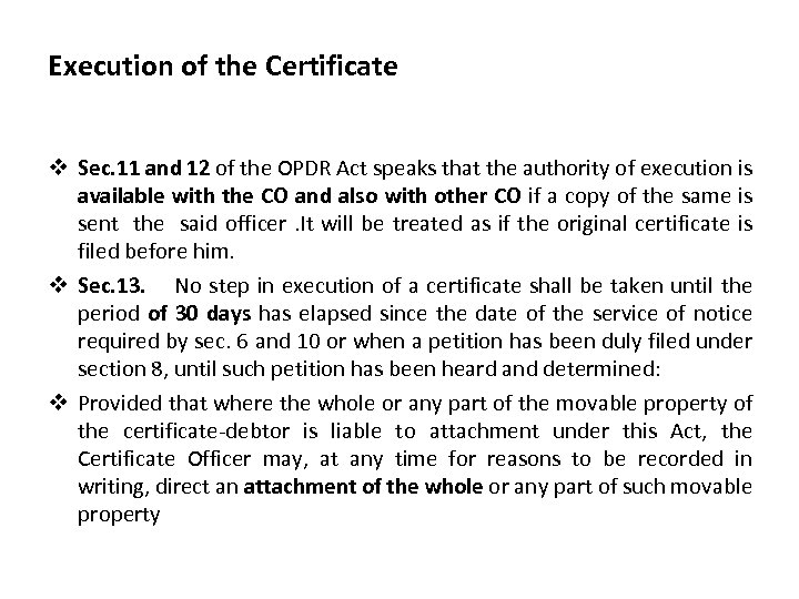 Execution of the Certificate v Sec. 11 and 12 of the OPDR Act speaks that the authority of execution is available with the CO and also with other CO if a copy of the same is sent the said officer. It will be treated as if the original certificate is filed before him. v Sec. 13. No step in execution of a certificate shall be taken until the period of 30 days has elapsed since the date of the service of notice required by sec. 6 and 10 or when a petition has been duly filed under section 8, until such petition has been heard and determined: v Provided that where the whole or any part of the movable property of the certificate-debtor is liable to attachment under this Act, the Certificate Officer may, at any time for reasons to be recorded in writing, direct an attachment of the whole or any part of such movable property