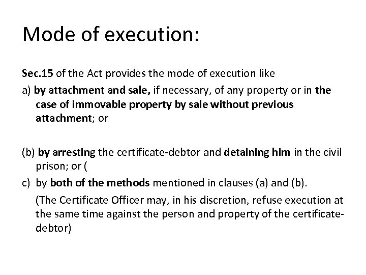 Mode of execution: Sec. 15 of the Act provides the mode of execution like a) by attachment and sale, if necessary, of any property or in the case of immovable property by sale without previous attachment; or (b) by arresting the certificate-debtor and detaining him in the civil prison; or ( c) by both of the methods mentioned in clauses (a) and (b). (The Certificate Officer may, in his discretion, refuse execution at the same time against the person and property of the certificatedebtor)
