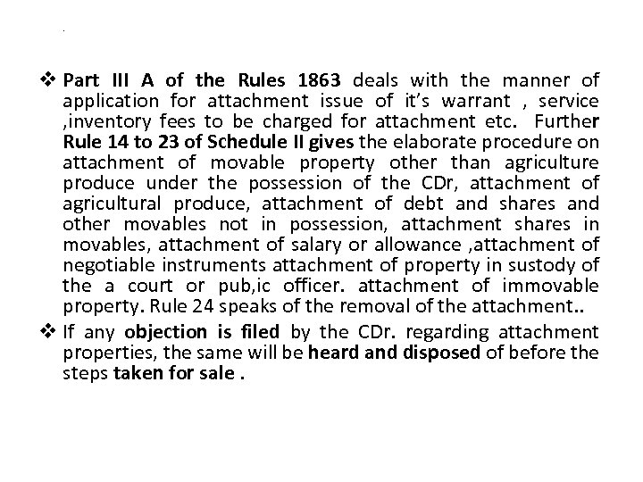 . v Part III A of the Rules 1863 deals with the manner of application for attachment issue of it’s warrant , service , inventory fees to be charged for attachment etc. Further Rule 14 to 23 of Schedule II gives the elaborate procedure on attachment of movable property other than agriculture produce under the possession of the CDr, attachment of agricultural produce, attachment of debt and shares and other movables not in possession, attachment shares in movables, attachment of salary or allowance , attachment of negotiable instruments attachment of property in sustody of the a court or pub, ic officer. attachment of immovable property. Rule 24 speaks of the removal of the attachment. . v If any objection is filed by the CDr. regarding attachment properties, the same will be heard and disposed of before the steps taken for sale.