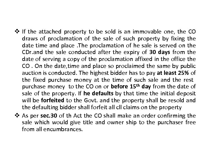 v If the attached property to be sold is an immovable one, the CO draws of proclamation of the sale of such property by fixing the date time and place. The proclamation of he sale is served on the CDr. and the sale conducted after the expiry of 30 days from the date of serving a copy of the proclamation affixed in the office the CO. On the date, time and place so proclaimed the same by public auction is conducted. The highest bidder has to pay at least 25% of the fixed purchase money at the time of such sale and the rest purchase money to the CO on or before 15 th day from the date of sale of the property. If he defaults by that time the initial deposit will be forfeited to the Govt. and the property shall be resold and the defaulting bidder shall forfeit all claims on the property v As per sec. 30 of th Act the CO shall make an order confirming the sale which would give title and owner ship to the purchaser free from all encumbrances.