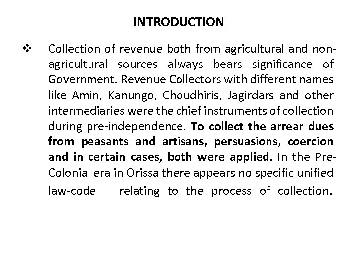 INTRODUCTION v Collection of revenue both from agricultural and nonagricultural sources always bears significance of Government. Revenue Collectors with different names like Amin, Kanungo, Choudhiris, Jagirdars and other intermediaries were the chief instruments of collection during pre-independence. To collect the arrear dues from peasants and artisans, persuasions, coercion and in certain cases, both were applied. In the Pre. Colonial era in Orissa there appears no specific unified law-code relating to the process of collection.