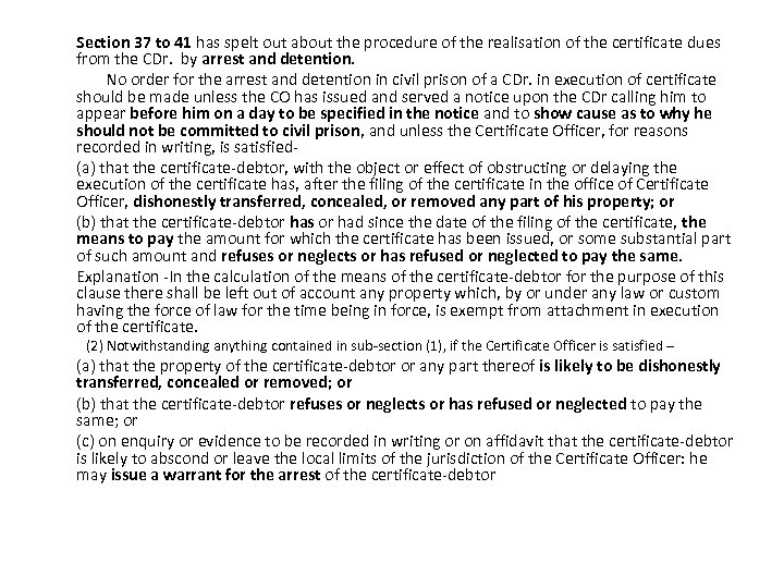 Section 37 to 41 has spelt out about the procedure of the realisation of the certificate dues from the CDr. by arrest and detention. No order for the arrest and detention in civil prison of a CDr. in execution of certificate should be made unless the CO has issued and served a notice upon the CDr calling him to appear before him on a day to be specified in the notice and to show cause as to why he should not be committed to civil prison, and unless the Certificate Officer, for reasons recorded in writing, is satisfied(a) that the certificate-debtor, with the object or effect of obstructing or delaying the execution of the certificate has, after the filing of the certificate in the office of Certificate Officer, dishonestly transferred, concealed, or removed any part of his property; or (b) that the certificate-debtor has or had since the date of the filing of the certificate, the means to pay the amount for which the certificate has been issued, or some substantial part of such amount and refuses or neglects or has refused or neglected to pay the same. Explanation -In the calculation of the means of the certificate-debtor for the purpose of this clause there shall be left out of account any property which, by or under any law or custom having the force of law for the time being in force, is exempt from attachment in execution of the certificate. (2) Notwithstanding anything contained in sub-section (1), if the Certificate Officer is satisfied – (a) that the property of the certificate-debtor or any part thereof is likely to be dishonestly transferred, concealed or removed; or (b) that the certificate-debtor refuses or neglects or has refused or neglected to pay the same; or (c) on enquiry or evidence to be recorded in writing or on affidavit that the certificate-debtor is likely to abscond or leave the local limits of the jurisdiction of the Certificate Officer: he may issue a warrant for the arrest of the certificate-debtor