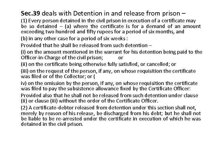 Sec. 39 deals with Detention in and release from prison – (1) Every person detained in the civil prison in execution of a certificate may be so detained – (a) where the certificate is for a demand of an amount exceeding two hundred and fifty rupees for a period of six months, and (b) in any other case for a period of six weeks : Provided that he shall be released from such detention – (i) on the amount mentioned in the warrant for his detention being paid to the Officer-in-Charge of the civil prison; or (ii) on the certificate being otherwise fully satisfied, or cancelled; or (iii) on the request of the person, if any, on whose requisition the certificate was filed or of the Collector; or ( iv) on the omission by the person, if any, on whose requisition the certificate was filed to pay the subsistence allowance fixed by the Certificate Officer: Provided also that he shall not be released from such detention under clause (ii) or clause (iii) without the order of the Certificate Officer. (2) A certificate-debtor released from detention under this section shall not, merely by reason of his release, be discharged from his debt; but he shall not be liable to be re-arrested under the certificate in execution of which he was detained in the civil prison.