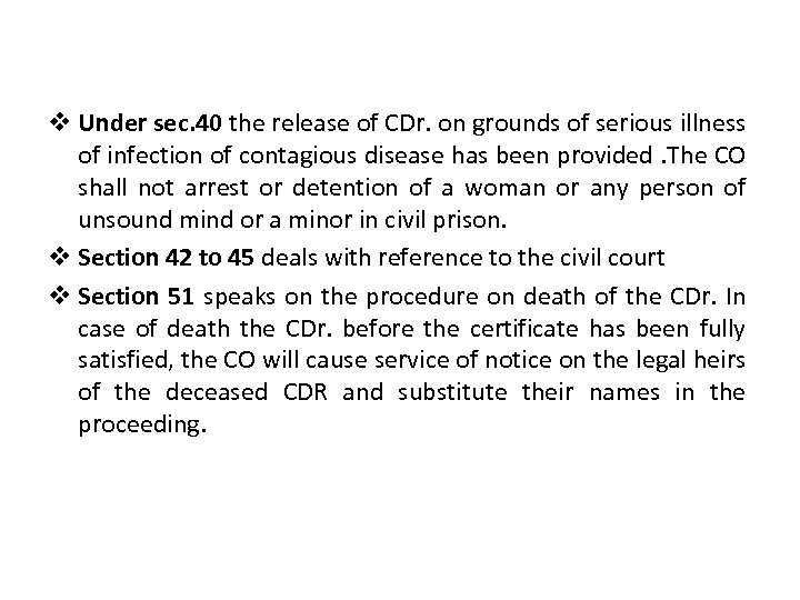 v Under sec. 40 the release of CDr. on grounds of serious illness of infection of contagious disease has been provided. The CO shall not arrest or detention of a woman or any person of unsound mind or a minor in civil prison. v Section 42 to 45 deals with reference to the civil court v Section 51 speaks on the procedure on death of the CDr. In case of death the CDr. before the certificate has been fully satisfied, the CO will cause service of notice on the legal heirs of the deceased CDR and substitute their names in the proceeding.