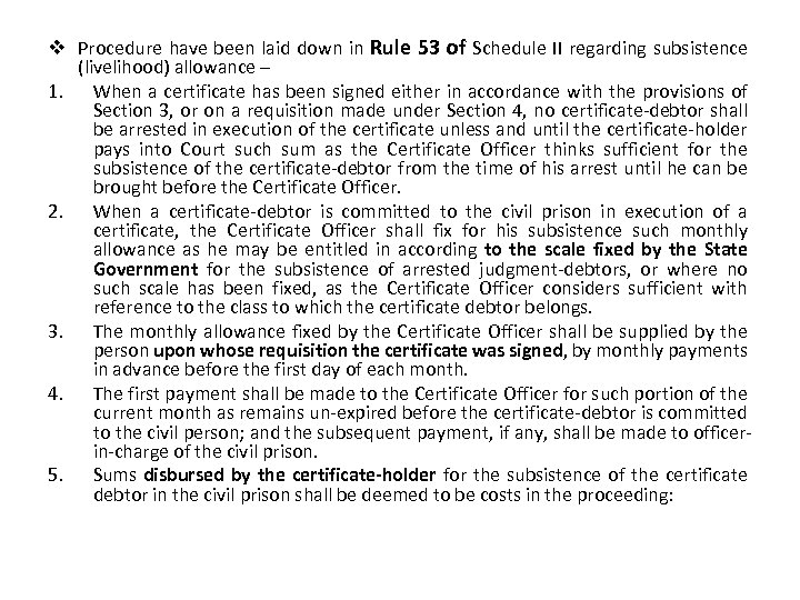 v Procedure have been laid down in Rule 53 of Schedule II regarding subsistence (livelihood) allowance – 1. When a certificate has been signed either in accordance with the provisions of Section 3, or on a requisition made under Section 4, no certificate-debtor shall be arrested in execution of the certificate unless and until the certificate-holder pays into Court such sum as the Certificate Officer thinks sufficient for the subsistence of the certificate-debtor from the time of his arrest until he can be brought before the Certificate Officer. 2. When a certificate-debtor is committed to the civil prison in execution of a certificate, the Certificate Officer shall fix for his subsistence such monthly allowance as he may be entitled in according to the scale fixed by the State Government for the subsistence of arrested judgment-debtors, or where no such scale has been fixed, as the Certificate Officer considers sufficient with reference to the class to which the certificate debtor belongs. 3. The monthly allowance fixed by the Certificate Officer shall be supplied by the person upon whose requisition the certificate was signed, by monthly payments in advance before the first day of each month. 4. The first payment shall be made to the Certificate Officer for such portion of the current month as remains un-expired before the certificate-debtor is committed to the civil person; and the subsequent payment, if any, shall be made to officerin-charge of the civil prison. 5. Sums disbursed by the certificate-holder for the subsistence of the certificate debtor in the civil prison shall be deemed to be costs in the proceeding: