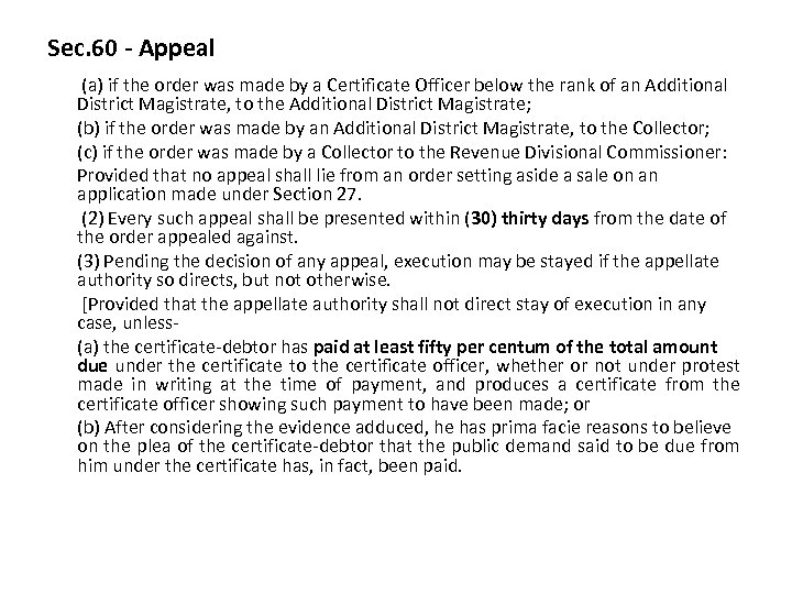 Sec. 60 - Appeal (a) if the order was made by a Certificate Officer below the rank of an Additional District Magistrate, to the Additional District Magistrate; (b) if the order was made by an Additional District Magistrate, to the Collector; (c) if the order was made by a Collector to the Revenue Divisional Commissioner: Provided that no appeal shall lie from an order setting aside a sale on an application made under Section 27. (2) Every such appeal shall be presented within (30) thirty days from the date of the order appealed against. (3) Pending the decision of any appeal, execution may be stayed if the appellate authority so directs, but not otherwise. [Provided that the appellate authority shall not direct stay of execution in any case, unless(a) the certificate-debtor has paid at least fifty per centum of the total amount due under the certificate to the certificate officer, whether or not under protest made in writing at the time of payment, and produces a certificate from the certificate officer showing such payment to have been made; or (b) After considering the evidence adduced, he has prima facie reasons to believe on the plea of the certificate-debtor that the public demand said to be due from him under the certificate has, in fact, been paid.