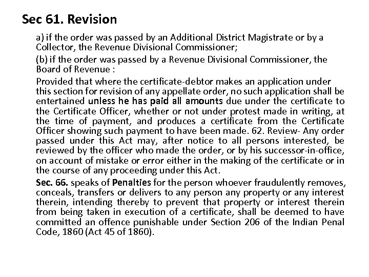 Sec 61. Revision a) if the order was passed by an Additional District Magistrate or by a Collector, the Revenue Divisional Commissioner; (b) if the order was passed by a Revenue Divisional Commissioner, the Board of Revenue : Provided that where the certificate-debtor makes an application under this section for revision of any appellate order, no such application shall be entertained unless he has paid all amounts due under the certificate to the Certificate Officer, whether or not under protest made in writing, at the time of payment, and produces a certificate from the Certificate Officer showing such payment to have been made. 62. Review- Any order passed under this Act may, after notice to all persons interested, be reviewed by the officer who made the order, or by his successor-in-office, on account of mistake or error either in the making of the certificate or in the course of any proceeding under this Act. Sec. 66. speaks of Penalties for the person whoever fraudulently removes, conceals, transfers or delivers to any person any property or any interest therein, intending thereby to prevent that property or interest therein from being taken in execution of a certificate, shall be deemed to have committed an offence punishable under Section 206 of the Indian Penal Code, 1860 (Act 45 of 1860).