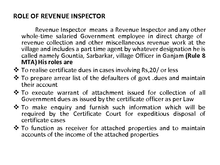 ROLE OF REVENUE INSPECTOR v v v Revenue Inspector means a Revenue Inspector and any other whole-time salaried Government employee in direct charge of revenue collection and other miscellaneous revenue work at the village and includes a part time agent by whatever designation he is called namely Gountia, Sarbarkar, village Officer in Ganjam (Rule 8 MTA) His roles are To realise certificate dues in cases involving Rs, 20/ or less To prepare arrear list of the defaulters of govt. dues and maintain their account To execute warrant of attachment issued for collection of all Government dues as issued by the certificate officer as per Law To make enquiry and furnish such information which will be required by the Certificate Court for expeditious disposal of certificate cases To function as receiver for attached properties and to maintain accounts of the income of the attached properties