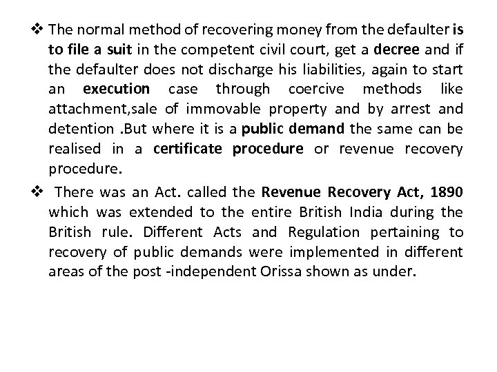 v The normal method of recovering money from the defaulter is to file a suit in the competent civil court, get a decree and if the defaulter does not discharge his liabilities, again to start an execution case through coercive methods like attachment, sale of immovable property and by arrest and detention. But where it is a public demand the same can be realised in a certificate procedure or revenue recovery procedure. v There was an Act. called the Revenue Recovery Act, 1890 which was extended to the entire British India during the British rule. Different Acts and Regulation pertaining to recovery of public demands were implemented in different areas of the post -independent Orissa shown as under.