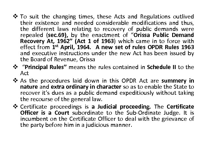 v To suit the changing times, these Acts and Regulations outlived their existence and needed considerable modifications and thus, the different laws relating to recovery of public demands were repealed (sec. 69), by the enactment of “Orissa Public Demand Recovery At, 1962” (Act 1 of 1963) which came in to force with effect from 1 st April, 1964. A new set of rules OPDR Rules 1963 and executive instructions under the new Act has been issued by the Board of Revenue, Orissa v “Principal Rules” means the rules contained in Schedule II to the Act v As the procedures laid down in this OPDR Act are summery in nature and extra ordinary in character so as to enable the State to recover it’s dues as a public demand expeditiously without taking the recourse of the general law. v Certificate proceedings is a Judicial proceeding. The Certificate Officer is a Court subordinate to the Sub-Ordinate Judge. It is incumbent on the Certificate Officer to deal with the grievance of the party before him in a judicious manner.