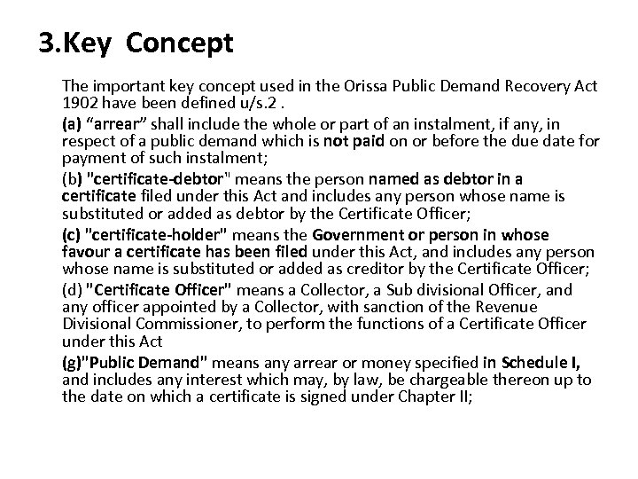 3. Key Concept The important key concept used in the Orissa Public Demand Recovery Act 1902 have been defined u/s. 2. (a) “arrear” shall include the whole or part of an instalment, if any, in respect of a public demand which is not paid on or before the due date for payment of such instalment; (b) "certificate-debtor" means the person named as debtor in a certificate filed under this Act and includes any person whose name is substituted or added as debtor by the Certificate Officer; (c) "certificate-holder" means the Government or person in whose favour a certificate has been filed under this Act, and includes any person whose name is substituted or added as creditor by the Certificate Officer; (d) "Certificate Officer" means a Collector, a Sub divisional Officer, and any officer appointed by a Collector, with sanction of the Revenue Divisional Commissioner, to perform the functions of a Certificate Officer under this Act (g)"Public Demand" means any arrear or money specified in Schedule I, and includes any interest which may, by law, be chargeable thereon up to the date on which a certificate is signed under Chapter II;