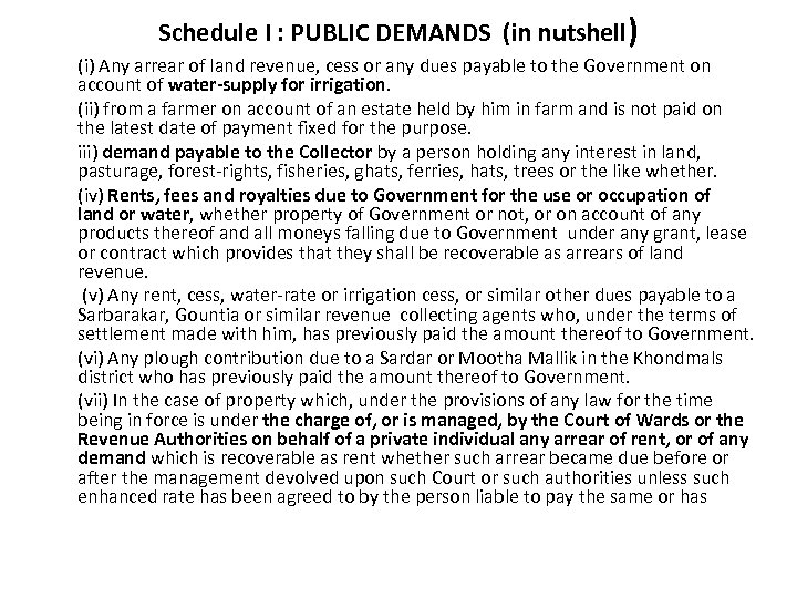 Schedule I : PUBLIC DEMANDS (in nutshell) (i) Any arrear of land revenue, cess or any dues payable to the Government on account of water-supply for irrigation. (ii) from a farmer on account of an estate held by him in farm and is not paid on the latest date of payment fixed for the purpose. iii) demand payable to the Collector by a person holding any interest in land, pasturage, forest-rights, fisheries, ghats, ferries, hats, trees or the like whether. (iv) Rents, fees and royalties due to Government for the use or occupation of land or water, whether property of Government or not, or on account of any products thereof and all moneys falling due to Government under any grant, lease or contract which provides that they shall be recoverable as arrears of land revenue. (v) Any rent, cess, water-rate or irrigation cess, or similar other dues payable to a Sarbarakar, Gountia or similar revenue collecting agents who, under the terms of settlement made with him, has previously paid the amount thereof to Government. (vi) Any plough contribution due to a Sardar or Mootha Mallik in the Khondmals district who has previously paid the amount thereof to Government. (vii) In the case of property which, under the provisions of any law for the time being in force is under the charge of, or is managed, by the Court of Wards or the Revenue Authorities on behalf of a private individual any arrear of rent, or of any demand which is recoverable as rent whether such arrear became due before or after the management devolved upon such Court or such authorities unless such enhanced rate has been agreed to by the person liable to pay the same or has