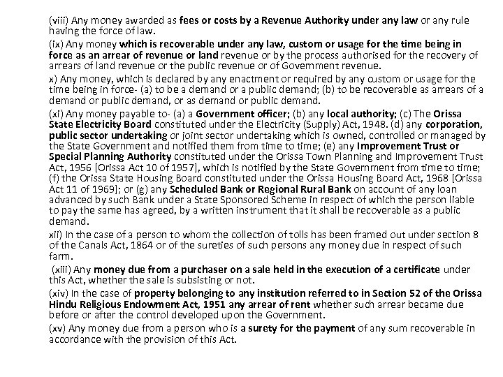 (viii) Any money awarded as fees or costs by a Revenue Authority under any law or any rule having the force of law. (ix) Any money which is recoverable under any law, custom or usage for the time being in force as an arrear of revenue or land revenue or by the process authorised for the recovery of arrears of land revenue or the public revenue or of Government revenue. x) Any money, which is declared by any enactment or required by any custom or usage for the time being in force- (a) to be a demand or a public demand; (b) to be recoverable as arrears of a demand or public demand, or as demand or public demand. (xi) Any money payable to- (a) a Government officer; (b) any local authority; (c) The Orissa State Electricity Board constituted under the Electricity (Supply) Act, 1948. (d) any corporation, public sector undertaking or joint sector undertaking which is owned, controlled or managed by the State Government and notified them from time to time; (e) any Improvement Trust or Special Planning Authority constituted under the Orissa Town Planning and Improvement Trust Act, 1956 [Orissa Act 10 of 1957], which is notified by the State Government from time to time; (f) the Orissa State Housing Board constituted under the Orissa Housing Board Act, 1968 [Orissa Act 11 of 1969]; or (g) any Scheduled Bank or Regional Rural Bank on account of any loan advanced by such Bank under a State Sponsored Scheme in respect of which the person liable to pay the same has agreed, by a written instrument that it shall be recoverable as a public demand. xii) In the case of a person to whom the collection of tolls has been framed out under section 8 of the Canals Act, 1864 or of the sureties of such persons any money due in respect of such farm. (xiii) Any money due from a purchaser on a sale held in the execution of a certificate under this Act, whether the sale is subsisting or not. (xiv) In the case of property belonging to any institution referred to in Section 52 of the Orissa Hindu Religious Endowment Act, 1951 any arrear of rent whether such arrear became due before or after the control developed upon the Government. (xv) Any money due from a person who is a surety for the payment of any sum recoverable in accordance with the provision of this Act.