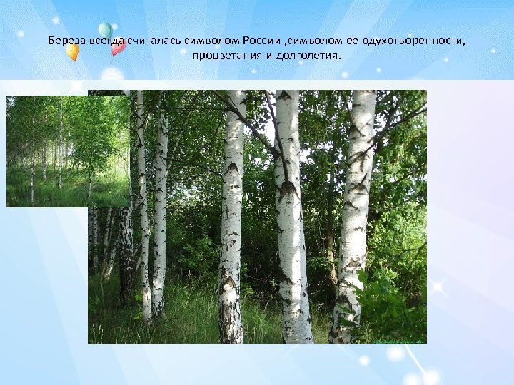 Береза всегда считалась символом России , символом ее одухотворенности, процветания и долголетия.