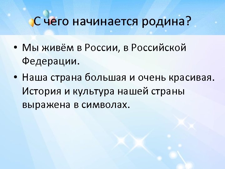 С чего начинается родина? • Мы живём в России, в Российской Федерации. • Наша страна большая и очень красивая. История и культура нашей страны выражена в символах.