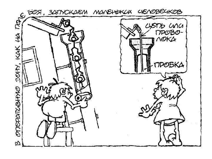 С чего начинать, применяя метод моделирования маленькими человечками? • Первое: выявить оперативную зону задачи, т. е. место, где возникло физическое противоречие. • Второе: выявить элемент, который испытывает противоречивые требования по своему физическому состоянию, когда к нему предъявляются требования идеальности. • Третье: запустить в этот элемент маленьких человечков или изобразить его в виде толпы маленьких человечков. Должно быть два рисунка – исходное состояние и требуемое. Рисуя человечков, не жалейте карандаш и время. Человечков должно быть много, и помните, что они могут делать все(!), даже самое фантастическое, самое невероятное. Для них нет невозможного, нет запретов, они всемогущи и выполняют любое ваше желание. Не надо пока думать, КАК они это сделают, важно выяснить, ЧТО они должны делать. Позже, в соответствии с вашими знаниями, вы найдете способ, как достичь то, что показали человечки. Чаще всего приходится изменять прилегающие к оперативной зоне элементы, но вы уже знаете, как делать, потому что вам в этом помогли маленькие человечки.