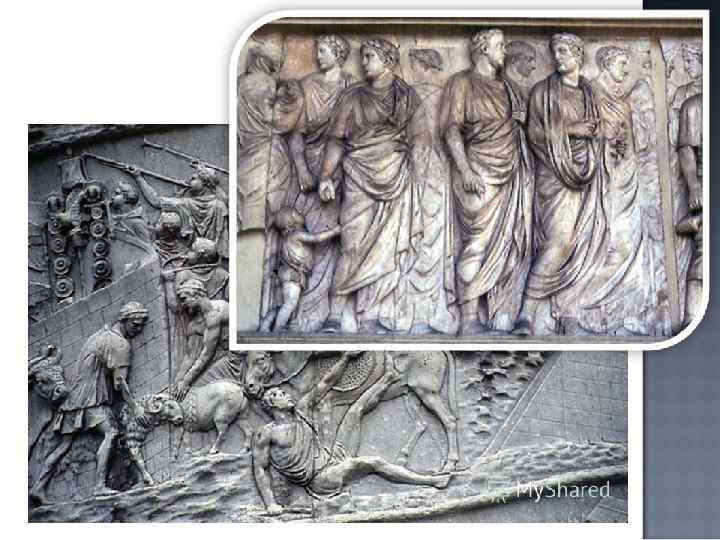 Исторический Рельеф Интерес к истории как к последовательному развитию событий заметен в барельефах с «непрерывным повествованием» . Колонна Траяна и Алтарь Мира — пример их использования. На рельефах изображены исторические события, жертвоприношение, торжественная процессия. Фигуры аккуратно расположены параллельными планами, уходящими вглубь: перспектива поставлена на службу символической иерархии.