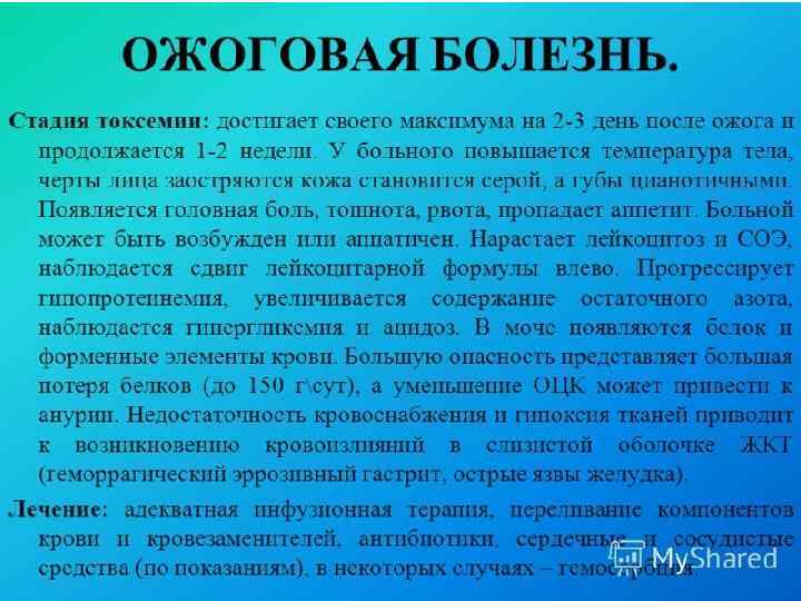 Задачи ЛФК в разные периоды лечения • • • • • в периоды острой ожоговой токсемии и септикотоксемии: нормализация деятельности ЦНС, сердечно сосудистой и дыхательной систем; профилактика возможных осложнений (пневмонии, тромбоза, атонии кишечника); улучшение трофических процессов в поврежденных тканях; сохранение подвижности в суставах поврежденных сегментов тела; предупреждение нарушений функции в непораженных конечностях (профилактика контрактур, атрофии мышц). в предоперационном периоде: снятие эмоционального напряжения у больного перед операцией; улучшение функционального состояния сердечно сосудистой и дыхательной систем; улучшение кровообращения в пораженном и донорском сегментах тела; обучение грудному типу дыхания – при необходимости вынужденного положения тела лежа на животе после операции. в послеоперационном периоде: профилактика послеоперационных осложнений (пневмонии, тромбофлебита, атонии кишечника); улучшение деятельности сердечно сосудистой и дыхательной систем; активизация кровотока в донорском сегменте тела и в месте пересадки тканей – с целью ускорения заживления; профилактика тугоподвижности в суставах и атрофии мышц. в период выздоровления: формирование компенсаций необратимых нарушений, вызванных ожоговой болезнью; адаптация организма к бытовым и трудовым нагрузкам.