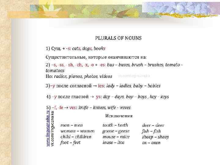 Check-up your answers trees cities addresses horses buses stories feet wives wolves knives cherries potatoes matches tomatoes dishes beaches women teeth bodies parties eggs