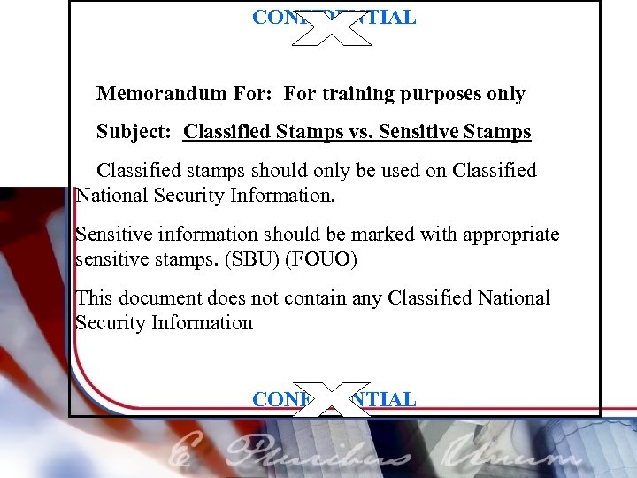 CONFIDENTIAL Memorandum For: For training purposes only Subject: Classified Stamps vs. Sensitive Stamps Classified stamps should only be used on Classified National Security Information. Sensitive information should be marked with appropriate sensitive stamps. (SBU) (FOUO) This document does not contain any Classified National Security Information CONFIDENTIAL